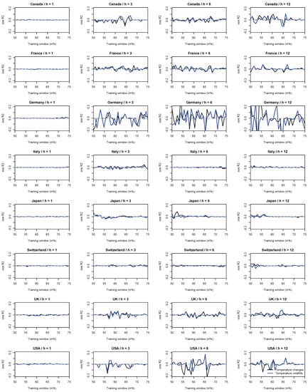 While cross-validating the shrinkage parameter introduces a certain degree of random variability into the results, the results reported in Figure 3 make it clear that the evidence of in-sample predictability does not carry over to our out-of-sample forecasting exercise. The out-of-sample statistic either hovers around zero (for example, for ) or exhibits large and unsystematic fluctuations (for example, in the case of Germany), implying that it is sensitive to the choice of the out-of-sample period. Importantly, there are no signs for any country/forecast-horizon configuration that the out-of-sample statistic consistently assumes positive values. Hence, we find that the climate predictors do not systematically contain incremental predictive value for subsequent stock market returns not already contained by the predictors used by the benchmark model.
