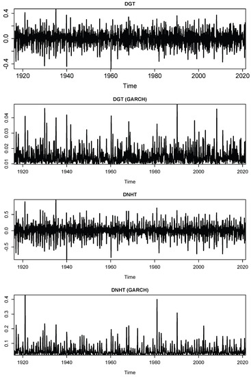 Changes in temperature anomalies and volatility. DGT = change in global temperature anomaly. DNHT = change in northern hemisphere temperature anomaly. DGT (GARCH) = volatility of change in the global temperature anomaly. DNHT (GARCH) = volatility of change in the northern hemisphere temperature anomaly.