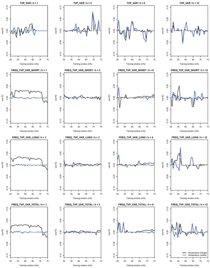 Out-of-sample statistic for stock market connectedness. The horizontal axis shows the length of the training window (in percent of the total sample). The vertical axis shows the out-of-sample statistic. Black line = the rival model includes temperature changes as a potential predictor. Blue line = the rival model includes temperature volatility as a potential predictor. The temperature variables are based on changes in the northern hemisphere temperature anomaly and its volatility. The temperature variables are based on changes in the northern hemisphere temperature anomaly and its volatility. The parameter h denotes the forecast horizon.