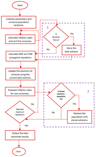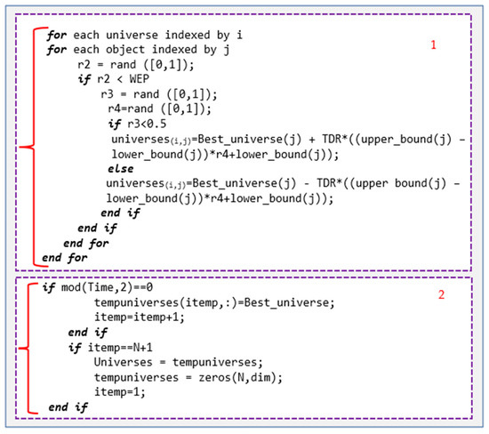 The pseudocode for the proposed algorithm is shown in Figure 4. Blocks 1 and block 2 in this figure show the code for the proposed algorithm. block 1 is the original MVO code and block 2 shows the code added to the original code for the modification. The best universe is stored after every second iteration in a variable named tempuniverses, and when the stored solution is equal to the initialized population size, it replaces the existing population with this new stored population set.