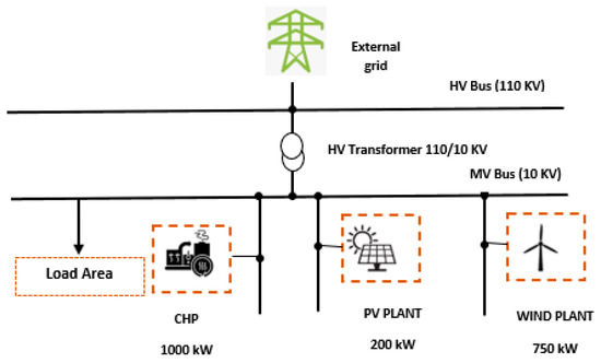 The dataset for generation and load demand is adopted from [67], whereas the rated capacity of the CHP, wind turbine, and solar plant is 1000 kW, 750 kW, and 200 kW, respectively. In addition, renewable sources of energy, i.e., solar and wind power plants, are intermittent sources and thus provide inconsistent generation power at every hour. In contrast, CHP offers the same energy for an entire day. It is assumed that the generated power through available generation sources will never run out at each hour. As a result, the microgrid operates in an island mode, drawing no electricity from the primary grid. Figure 7 represents the power generated by different generation sources, whereas Figure 8 shows the 24-h load dataset.