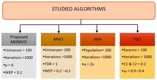 The algorithms are executed on a system with a Windows 10, 64-bit operating system specification, Intel (R) core (T.M.) i5, and 8 GB RAM using MATLAB simulation software. Generally, microgrids are classified as small-scale, medium-scale, and large-scale microgrids depending on the power generated through them, demanded load, and the number of units associated with the microgrid. The authors implement the proposed MOMVO with other algorithms, MVO, AHA, and PSO, using available generation and load datasets for both test systems, and the results are thus compared. The simulation for a 24-h data set is run 30 times, and the best results are stated for a fair evaluation. Figure 6 shows the parameter settings for the assessed algorithms.