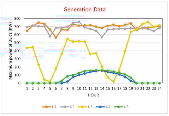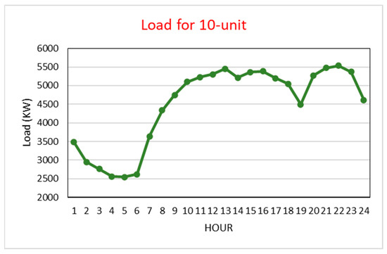 In case study 2, the 10-unit microgrid has 10 generation units [32] that behave as 10 decision variables. It is the same as presented in Figure 5, but the difference is it consists of seven wind plants, two solar plants, and a CHP. The vector solution is represented as . The load area for this case study is 141-node test system [32]. The overall cost is the total cost generated by each generation unit at hour t. So, using the power balance constraint, the power generated by the available units should be greater than or equal to the demanded power at any time t. However, it is assumed that generated electricity will always be sufficient to meet the required load at any given hour.