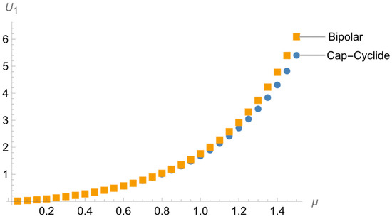 We conclude this section by noting that the cap-cyclide coordinates present a significant generalization of the bipolar system. Indeed, these coordinates include an additional parameter , changing which results in a variety of cross-sectional shapes, including been, D, prolate elliptical, and circular shapes, as shown in Figure 2. Since the 2D bipolar shape is only a particular case of the cap-cyclide coordinates achieved at , it is instructive what changes this parameter brings to the flux function. In Figure 3 and Figure 4 we show the radial and angular parts of the flux function for the cap-cyclide geometry compared to the bipolar case.