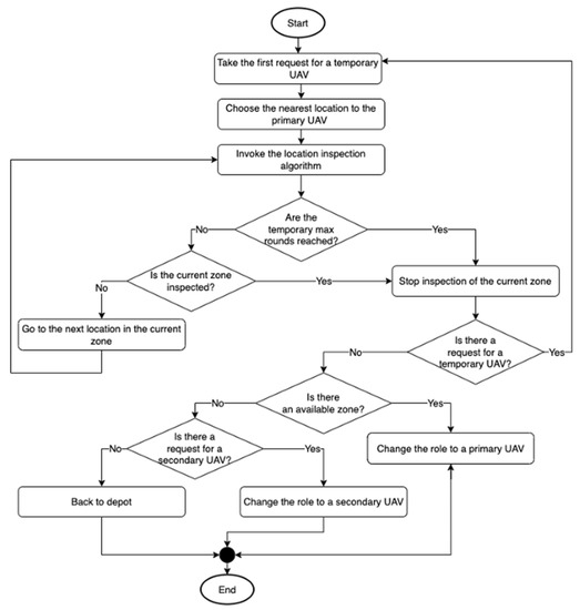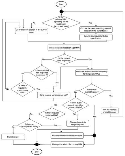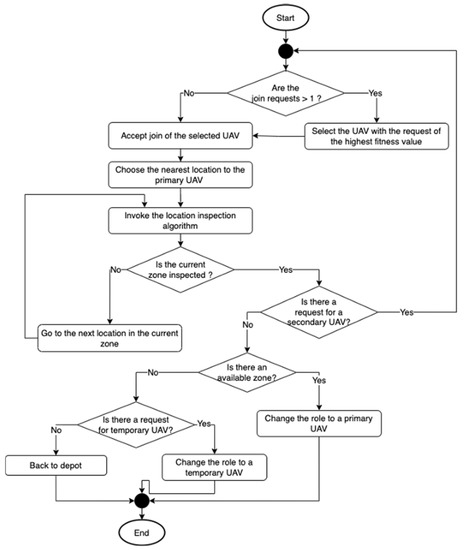 Each primary UAV will be assigned to one available zone, and the zone cannot have more than one primary UAV assigned to it. As the algorithm in Figure 3 shows, the primary UAV will choose a location in the assigned zone (at random if it is the first time inspecting this zone). In addition, each primary UAV is allowed to send one request for a secondary UAV to join it in the inspection process of the assigned zone. Even if this request has been fulfilled, the primary UAV cannot send more requests to the secondary UAV.