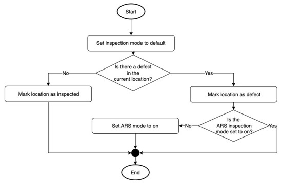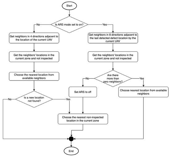 Available UAVs are categorized into three dynamically formed sets: primary, secondary, and temporary. The UAVs have different flying modes while executing the mission: default inspection mode and ARS inspection mode. In the default mode, the UAV scans the network location by moving to the closest point from its current position. If it detects a defect in any location, it switches to the ARS mode. In this mode, the UAV examines the surrounding areas of the defect more closely for a certain period before returning to the default mode. The UAVs adjust their roles dynamically according to the inspection coverage of each zone. The mission ends when all zones are inspected.