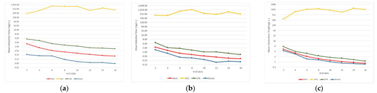 Mean detection time in different settings: (a) simple severity (3 × 10 defects); (b) average severity (9 × 20 defects); (c) advanced severity (27 × 30 defects).