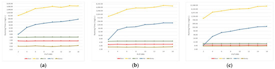 Running time in distance in different settings: (a) simple severity (3 × 10 defects); (b) average se-verity (9 × 20 defects); (c) complex severity (27 × 30 defects).