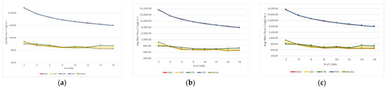 We measured the running time of each algorithm for every scenario by recording the time when the execution started and ended. Figure 14 shows the results, which indicate that booby outperformed all benchmarks in terms of speed. It solved all scenario instances faster than the other algorithms, with an average speedup of at least three times over random in simple settings (Figure 14a), three times over random in average settings (Figure 14b), and 1.2 times over random in advanced settings (Figure 14c). Moreover, booby’s running time did not increase exponentially as the number of UAVs increased, unlike PSO and ACO. This can be attributed to its efficient use of data structures such as k-d tree and dictionaries, as well as its ability to find a “good” solution within one iteration, unlike metaheuristic algorithms that require multiple iterations to converge.