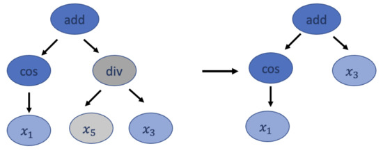 Unlike other genetic operations, the crossover requires two tournaments. In the first tournament, the winner is selected as the parent, and a random subtree is selected from it to be replaced. Then, another tournament is conducted and another winner is chosen to be a donor, and then, a random subtree is selected from the donor and is inserted into the original parent to form an offspring for the next generation. Figure 3 shows an example of the crossover transformation.