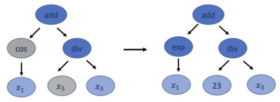 The point mutation takes a winner of the tournament as the parent and randomly selects nodes from it to be replaced. Functions are replaced by other functions, and terminals are replaced by other terminals with the same number of arguments. For example, function + can only be replaced by functions such as − and × since they all have two arguments. The resulting tree forms an offspring for the next generation. This method can also maintain the diversity in the population. Figure 6 shows an example of the point mutation transformation.