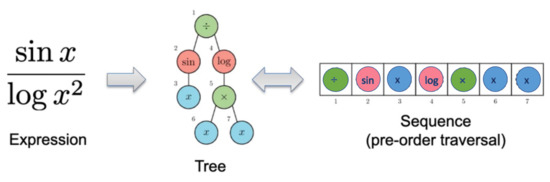 We have previously introduced that mathematical formulas can be described as trees, and trees can be traversed as sequences. Figure 9 shows an example of how to describe the function using a sequence. We call each node in this sequence as tokens and denote the ith token in traversal as and the length of the traversal as . Each token has a value within the function set or the terminal set, and we combine these two sets together and call it the library L.