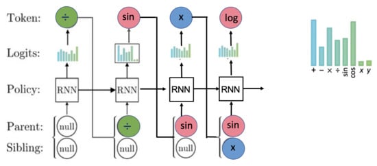 For each token, we use RNN to provide categorical distribution with parameters that define the probabilities of selecting each token from the library L, in this example, , where x and y are terminals, and others are functions.
