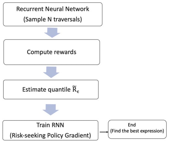 Since the reward function in DSR is not differentiable with respect to , in Peterson et al. (2021), the risk-seeking policy gradients are introduced to train the RNN, and we can finally summarize the full procedure of the deep symbolic regression.