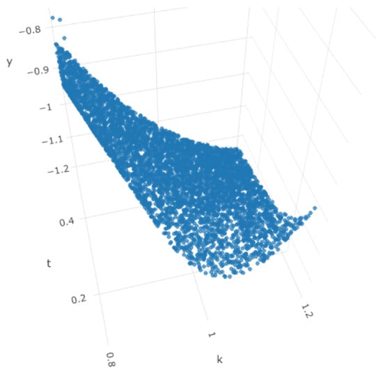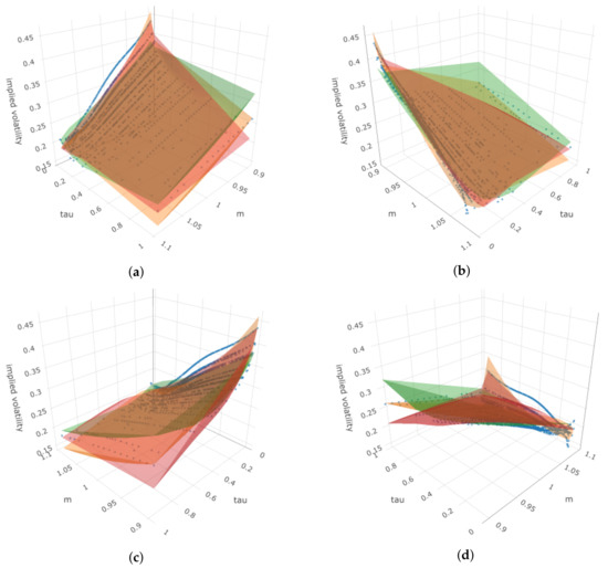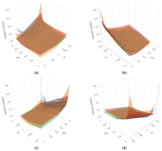 After these two equations were detected, we calculated the estimated implied volatility for each option and computed the correlation and RMSE for . The results are shown in Table 8. From Table 8, we can see that the benchmark model provides the highest correlation and lowest RMSE. Among GP-SR and DSR, GP-SR performs better. Figure 18 presents four angles for the 3D plot of IVS, moneyness k, and time to maturity . The blue dots represent the true observed implied volatility, and the surfaces with different colors represent the estimated implied volatility surfaces using different methods. From Figure 18, we can see that when we fix , the observed implied volatility generally increases as moneyness increases (third angle). However, when we fix the moneyness at different values, we can see obvious curves with smile shapes that move in different directions as time to maturity increases (fourth angle). All three methods can successfully capture these differences in directions.