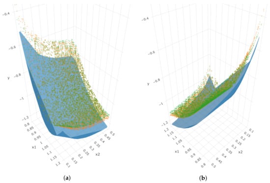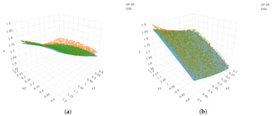 Both methods successfully detected the term even with but failed to detect . Figure 16 displays two angles of the 3D plot of y, and . The blue surface represents the true simulated response surface, while the dots with different colors represent the estimated responses obtained by the four “wrong” functions proposed by each method with different levels of noise. From Figure 16, we can see that the estimations obtained using DSR under are nearly identical to the true responses (blue surface), indicating that DSR can be highly sensitive to even small amounts of noise in the data. Thus, in this case, we may still consider that DSR has detected the “true” surface. Comparing DSR and GP-SR, even though DSR failed to detect the true function at lower noise levels, the results obtained by DSR are closer to the true surface than those from the GP approach when . In this case, DSR performs better under relatively higher noise levels. The RMSE values for the estimated responses obtained by each method and the true simulated responses are provided in Table 3.
