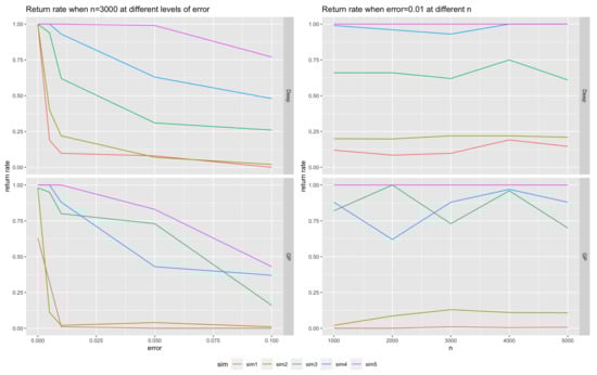 When we fixed and increased the number of observations n, there was no clear and stable trend in the changes in return rates for the same simulation type. This implies that the performances of both methods are more influenced by the complexity of the “true” relationships and noise levels and are less influenced by the size of the data, provided that .