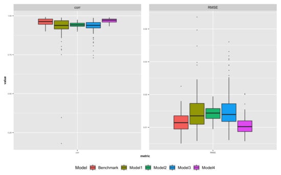 We applied the four non-linear models and the benchmark model to daily implied volatility data for all 1829 dates. We calculated the RMSE and correlation between predicted and observed implied volatility for each date using each method. The results are summarized in Table 9 and are shown in Figure 22, where box plots of the 1829 daily RMSE and correlation values for all five models are presented.