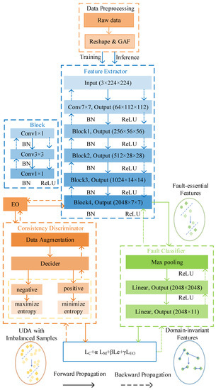 The framework of the proposed method used for cross-domain FD with imbalanced data is shown in Figure 2. By concerning the available source dataset under multiple working conditions for data preprocessing, the samples from each condition are all put into the network. Reshaping operations are conducted based on Gramian angular field (GAF) technique for all input data to generate a 2D image [26,27,28]. Note that the following UDA-EO framework still works if no GAF-based preprocessing is given.