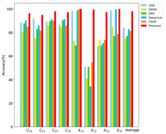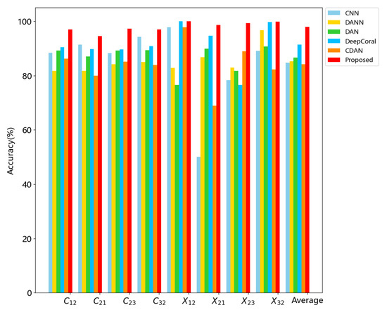 To validate the competitiveness of the proposed method, 5 other methods are implemented below for comparisons, including the baseline CNN, domain adversarial NN (DANN, [35]), deep coral [36], deep adaptation network (DAN, [37]) and conditional domain adversarial network (CDAN, [38]). According to the detailed settings shown in the references, the experimental parameters of all the models are properly fine-tuned.