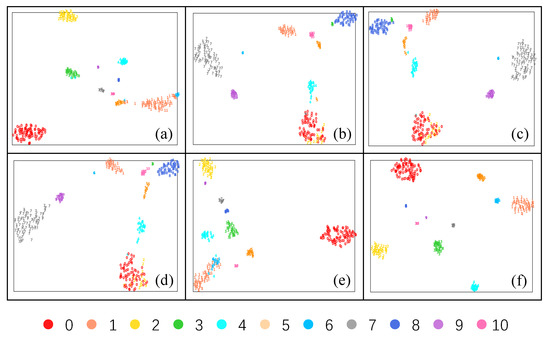 A result randomly selected from the experiment under IR2 is processed to visualize the classification effects. The 2D features are displayed by the t-SNE ([39]), as shown in Figure 7. It is observed from Figure 7a–e that the comparison methods have limited learning and separation effects on different health categories under severe class imbalance, resulting in quite a few incorrect classifications of the fault types. However, the classes shown in Figure 7f were effectively separated with a much clearer class boundary and a more compact learned class feature based on the proposed UDA-EO. The reasons come from the fact that UDA-EO well fits the distributions of the 11 fault types of the imbalanced samples in , and the overlaps of the class probability distributions are reduced under the conditional entropy minimization. These results indicate the effectiveness and feasibility of using the pseudolabel idea and the entropy minimization method to address the class-imbalanced problem.