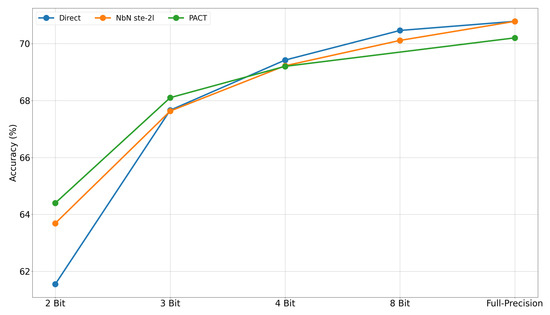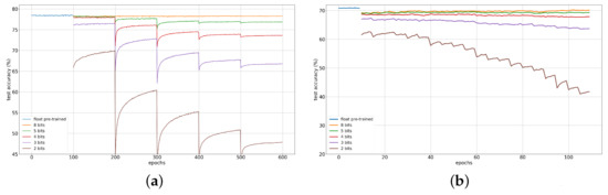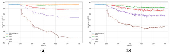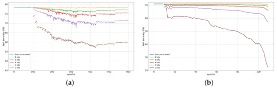 The test accuracy during direct training for considered models is shown in Figure 2a,b. We can see that direct quantization changes the NN dramatically, which results in a decrease in recognition accuracy, especially with a low bit-width (for example, accuracy for 2-bit quantization is slightly below 60%, while full-precision accuracy is about 80% for CIFAR-10). Despite that, such a simple approach results in good enough accuracy for 5–8-bits quantization. Final test accuracy is shown in Section 6.