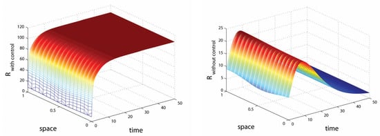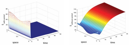 We have plotted immune, susceptible individuals with and without control by considering values of parameters as We can see that the population of immune individuals with control and without control increasing and decreasing to its stable state, respectively, see Figure 2. In the case of susceptible individuals, we get the opposite trend; see Figure 3.