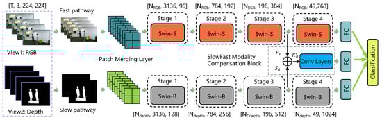Based on the dual-stream framework, two neural networks operating at different frame rates are designed to capture spatio-temporal features with different properties from the entire RGB and depth sequence. The proposed two-stream architecture for learning spatio-temporal information consists of two horizontal and independent pathways: one pathway processes depth sequences of low frame rate through the Swin-S network; the other pathway processes RGB sequences of high frame rate through the Swin-B network. In addition, SlowFast multimodality compensation block is designed to fuse data from two independent paths with different frame rates into a single convolutional neural network, with the aim of achieving higher performance gains for the model. The complete structure of the proposed network can be seen in Figure 1.