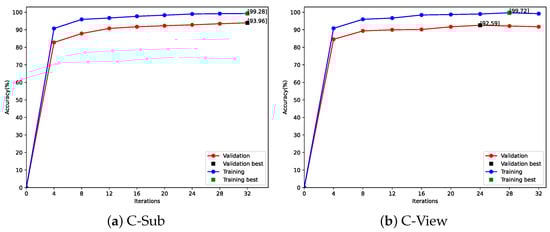 (4) Convergence of J-Swin-SFMCB-II: The is set to 5 in the experiments. Figure 4 displays the accuracy curves of training and validation for the two evaluation protocols on the PKU-MMD using J-Swin-SFMCB-II. The model converges rapidly, with the entire training process taking approximately 32 iterations. On the C-Sub and C-View protocols, the validation accuracy is able to converge to nearly 100% and best accuracy of training obtained 92.59% and 93.96%, respectively.