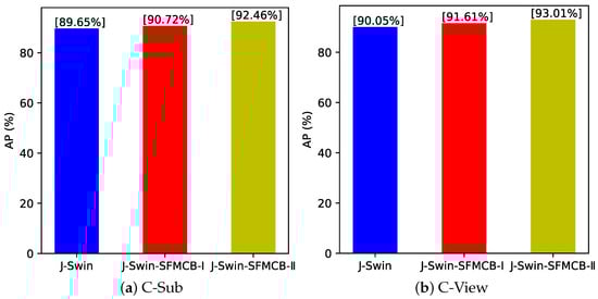 (5) Effectiveness from SFMCB: To interpret the benefits of SFMCB in capturing complementary features, we conduct rigorous experiments on the PKU-MMD dataset. Figure 5 expresses the experimental results. According to the analysis of the results, the proposed framework of J-Swin achieves recognition performances of 89.65%(C-Sub) and 90.05%(C-View). Meanwhile, under the work of SFMCB, the recognition performance of the framework on J-Swin-SFMCB-I has also been improved by 1.07% and 1.56%, respectively. Compared with J-Swin, the recognition accuracy of the J-Swin-SFMCB-II framework are also increased by 2.81% and 2.96%, respectively. The improvement factor can be attributed to the compensation function captured by SFMCB from the slow and fast pathways.