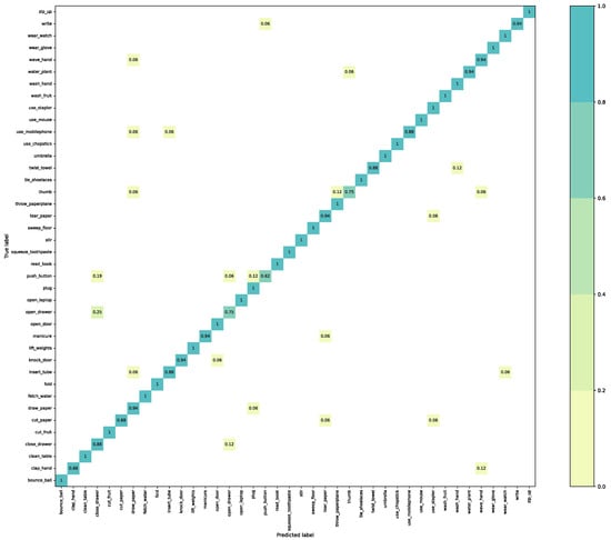 The experimental comparison results on the THU-READ dataset are shown in Table 4, where the experimental parameter . We can see from Table 4 that J-Swin-SFMCB-II achieves 87.0% and 94.2% for the CS and CG protocols, respectively. The confusion matrix of the CG protocol on the THU-READ dataset is shown in Figure 6 with group 3 used for training and the remaining groups used for testing. The proposed recognition framework performs perfectly on “bounce_ball”, “cut_fruit”, “fetch_water”, “fold”, “ wear_watch”, etc. However, some actions did not achieve accurate prediction results, such as “open_door”, “push_button”, and “thumb”. This is largely due to the similarity in appearance and action of the recognized objects.