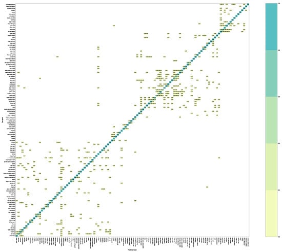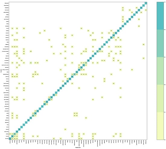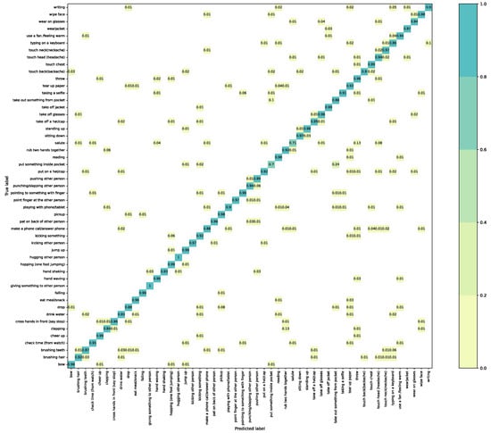 Figure 9 shows the confusion matrix matrices for C-Sub protocol on the NTU RGB+D 120 dataset. The proposed method performs perfectly on “carry object”, “bounce ball”, “kicking something”, “walking apart”, etc. We can also note that “putting on glasses” and “taking off glasses”, are frequently misidentified due to the high similarity between the objects in human–object interactions. Similarly, “counting money” and “folding paper” are also easily confused, as they have very similar appearances. These results suggest that the proposed dual-stream of SlowFast structure can effectively learn spatial-temporal feature and SFMCB strategy can capture the complementary information from multiple modalities.