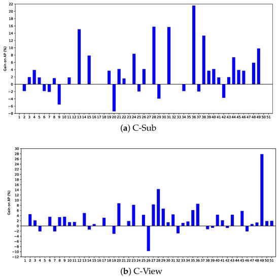 Figure 10 shows the improvement of J-Swin-SFMCB-II over J-Swin with [RGB, depth] inputs on the PKU-MMD. The proposed SFMCB significantly outperforms J-Swin on most actions, indicating that it can learn compensatory features from dual-stream networks to achieve significant performance improvements. For the C-Sub protocol, the proposed method achieves more than 10% improvement on complex actions such as “waving hand” (), “putting on a hat/hat” (), “rubbing two hands” (), and “Take Off Your Glasses” (). For the C-View protocol, many actions such as “pushing other person” (), “putting on a hat/ca” (), and “putting on glasses” () achieve significant improvements.