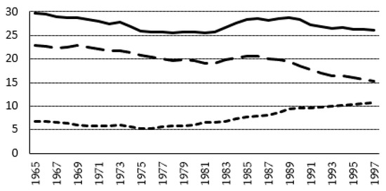 We use the chain index of the per capita GDP, employment and population size, and a measure of the degree of trade openness, defined as the sum of exports plus imports over GDP. We add this variable to the set of regressors in an attempt to control for technological transfers among economies. The human capital stock is measured as the average number of years of schooling, and is available in the Barro and Lee (2000) [38] dataset. Because investment is available in PWT 6.1, the producer capital stock per worker is obtained—up to 1992—from PWT 5.6 by Summer and Heston (1996) [39]. In order to lengthen the series until 1998, we apply a permanent inventory equation using the investment series in PWT 6.1. Growth rates are calculated from stocks.