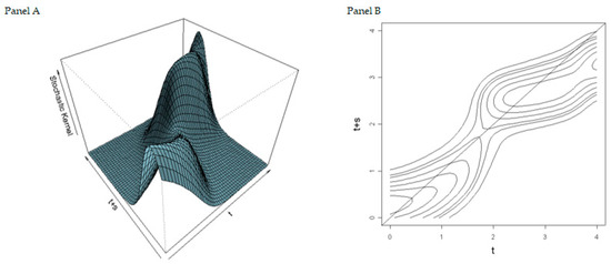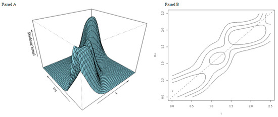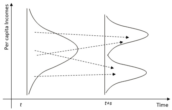 Quah (1993) [43] further suggests estimating the shape of the distribution directly so that results do not depend on groupings. By estimating the shape of the involved densities, it would be straightforward to assess the underlying dynamic and whether a conditional or a club conditional dynamic exists. Figure 3 represents an income distribution at time t and another (possible) distribution at time t + s.