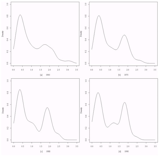 Ref. [10] proposes studying the shape of the distribution over time to test for convergence dynamics. If the distribution collapses to a unimodal shape, we have evidence in favour of the ACH and against the CCH. Conversely, if more than one peak emerges in the distribution, countries are catching up with one another, but only within particular subgroups; this evidence would be taken in favour of the CCH, and against the ACH.