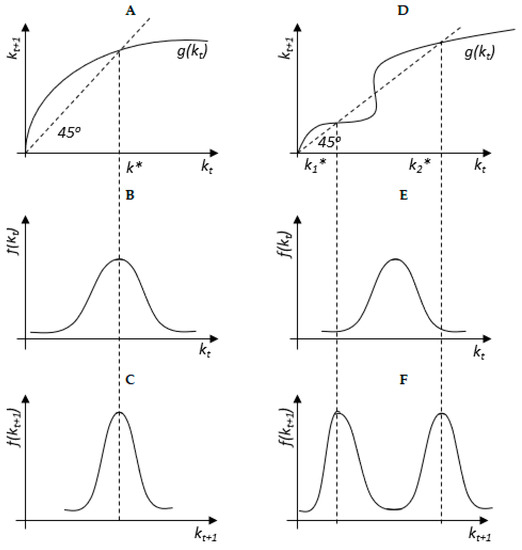 If instead, the production function for the representative economy has some non-convexities, as reported in the example in Panel D, then there are three equilibria, as the accumulation function crosses the 45-degree line three times. In this case, the equilibrium at the centre of the distribution is unstable, and the equilibria located at the tails are stable instead. Hence, at time t, even though the economies are clustered about the same equilibrium, as in Panel E, in the long run, the economies tend to catch up with each other only within subgroups, and more than one peak emerges, as from Panel E to F. The presence of non-convexities in this case leads to a multiple equilibria configuration (Caggiano and Leonida 2013 [44]).