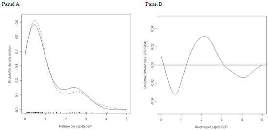 If we assume instead that they converge with the richer part of the rich cluster, for example, following what it is called a “growth miracle”, a larger number of observations with a per capita income higher than the mode of this cluster compose the rich cluster after the catching-up process. The resulting mode is again more pronounced, and it shifts to the right. The mode representing the poor group shifts to the left. The two modes appear more distant than earlier, even if a catch-up process occurred. Unimodality would be more strongly rejected. However, given a convergence process has occurred, this conclusion would be wrong. As an example, Figure 8 reports estimates of the distributions relative to the per capita GDP across economies for the years 1964 and 1975. These estimates were obtained using an average bandwidth as it is otherwise impossible to compare distributions estimated for different years [44]. Note that between these years, our sample of countries experienced an absolute convergence process. There is a mass shift from the modes to the centre of the distribution. We highlight this in panel B, by showing the smoothed differences between the two densities. Notice that the distributions display a bimodal shape. Hence, bimodality does not necessarily indicate evidence against the ACH.