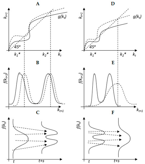 In Panel A, we report the accumulation path of capital per worker, g(k), in the case where, as described, there are non-convexities in the production function. If we assume that the economies share the same technology, as described above, depending on their initial positions, the economies will converge to the high-capital stable equilibrium, or to the low-capital stable equilibrium. Therefore, there will be two long-run stable equilibria in the distribution of incomes per capita, as in Panel B (full line). Assuming now that there is technological progress, the position of the accumulation path will change. More specifically, the path of capital accumulation rotates counter-clockwise. The new path of the accumulation of capital is represented with a dashed line, again in Panel A. Next, we assume that economies clustered at the lower stable equilibrium gain a greater advantage from the technological progress. This assumption is far from being new and it relates to the possibility that poorer economies gain advantage from the technological progress as they can copy it and have lower costs [46]. Therefore, because of the technological progress, all the economies will grow, but poor countries will grow more than rich economies. The new distribution of income is now represented in Panel B with a dashed line. The distribution is still bimodal; however, the low cluster shifts to the right more than the high cluster. We have two clusters of economies, but an absolute convergence process did take place. The variance in the distribution decreases.