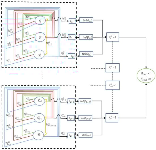 where refers to a multi-unit DHNN in which the structure leads to . After obtaining a satisfactory interpretation, the synaptic weight of can be obtained and is stored as CAM in each multi-unit DHNN. During the retrieval phase of the DHNN, the final neuron state is obtained using Equation (9) and is transformed into the following induced logic.