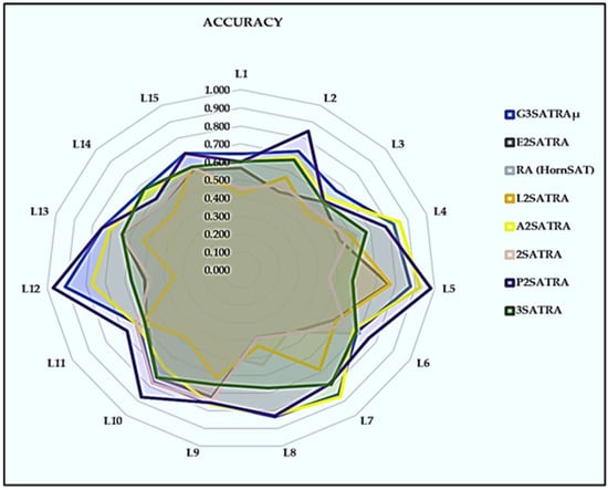 The performance of the model is compared with numerous well-known current works to confirm the efficiency of the suggested methodology. Even though there are numerous classification algorithms that have been introduced, including those proposed by [43,44,45,46,47], none of these studies have demonstrated that induced logical rules can effectively categorize and extract patterns from a dataset.. Note that the authors of [48] have proposed logic mining that utilizes a log-linear model, but the order of the logic is lower than what we propose in this paper. In addition, our proposed model is incomparable with the work in [49] due to the structure of the radial basis function neural network (RBFNN), which only produced a single . Thus, our proposed model is compared with the following state-of-the-art logic mining methods: