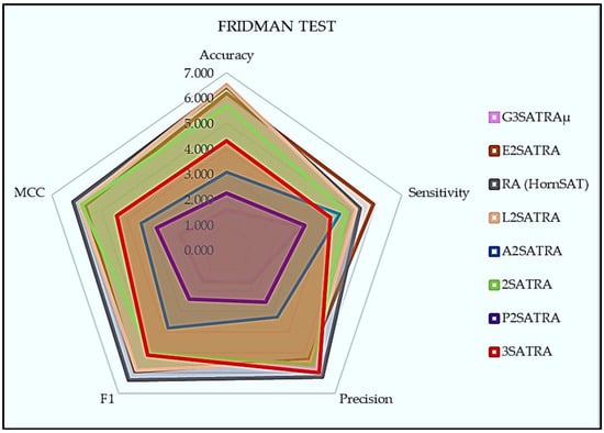 - All datasets with α = 0.05 and df= 7 were subjected to a Friedman rank test. The MCC p-value is , and . As a result, the null hypothesis that all logic mining models perform equally well was rejected. The highest average rank among the currently used methods is 1.87, for . At the same time, notice that P2SATRA, with an average rank of 2.800, is the method that most closely rivals . As a result, it indicates that all the confusion matrices proposed in this study statistically support ’s superiority over those in previous studies.