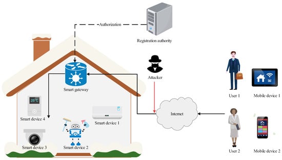 A typical smart home architecture shown in Figure 1 consists of four entities: registration authority (RA), gateway, smart device, and users. RA is a trusted entity that mainly authorizes the gateway as the home registration center. Gateway is a semi-trusted entity that helps users to communicate with smart home devices and is responsible for registration. Smart device refers to all kinds of smart home appliances in the family, such as smart refrigerators, smart air conditioners, etc., where they are semi-trusted entities, and are connected to the gateway by wireless networks to provide users with various services. Only family members can register with the gateway to become legal users. In this architecture, users need to connect the home devices via the gateway, and then operate the home devices through the smart home APP or voice assistant, such as adjusting the indoor temperature, switching lights, adjusting curtains, playing music, etc. Although the smart home has changed people’s lives, it faces many security threats and challenges. For example, since smart home devices are connected to the Internet, malicious attackers can access users’ private information by intercepting transmitted messages via open channels. Therefore, ensuring a secure smart-home IoT access control scheme is very important.