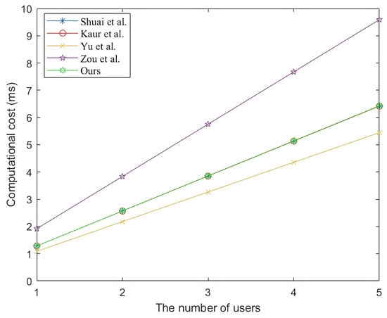 In Table 6, and Figure 3, the costs of [,,] for are less than our scheme. Our scheme requires an additional ms than [] and ms than [,]. In fact, the two values are reasonable in practice. More importantly, the three schemes have some security weaknesses mentioned in Table 4. Overall, our scheme provides both security and efficiency for .