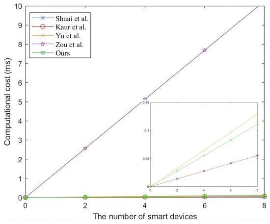 In Table 6, and Figure 4, the costs of [,,] for are less than our scheme. Our scheme requires an additional ms than [,] and ms than []. In fact, the two values are reasonable in practice. More importantly, the three schemes have some security weaknesses mentioned in Table 4. Overall, our scheme provides both security and efficiency for .