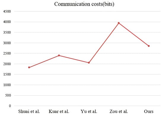 In Table 7, we show the communication costs between our and recently proposed schemes [,,,]. Note that the lengths of symmetric encryption and decryption , hash functions , timestamp T, integer , identify and ECC are defined by 256 bits, 256 bits, 128 bits, 160 bits, 32 bits, and 320 bits, respectively. Here, the total communication costs of our scheme are computed by bits. The communication costs of Shuai et al.’s scheme [] requires bits, Kaur et al.’s scheme [] requires bits, Yu et al.’s scheme [] requires bits, Zou et al.’s scheme [] requires bits. Finally, the results in Table 7 are depicted in Figure 5. It can be seen that Zou et al.’s scheme [] has the highest communication cost, Shuai et al.’s scheme [] has the lowest communication cost, and our scheme is lower than Zou et al.’s scheme [], slightly higher than Kaur et al.’s scheme [].