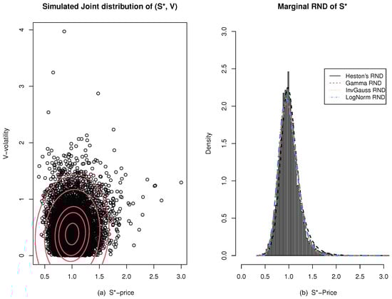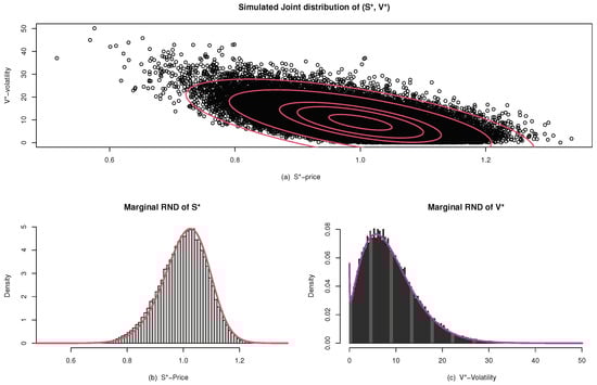To illustrate this relation, we draw 10,000 simulated pairs with a standardized spot price and volatility, according to the SV model in (1) as described above, with (arbitrarily chosen) and and with , , , and . Their joint distribution is presented in Figure 1a, where we have superimposed the matching 16%, 50%, 68%, 95%, and 99.5% contour lines. In Figure 1b, we present a histogram of the simulated marginal distribution of the spot price , along with the theoretical Heston’s RND calculated using (A5). In Figure 1c, we display a histogram of the simulated marginal distribution of the standardized volatility , along with the theoretical chi-squared density curve, according to (27).