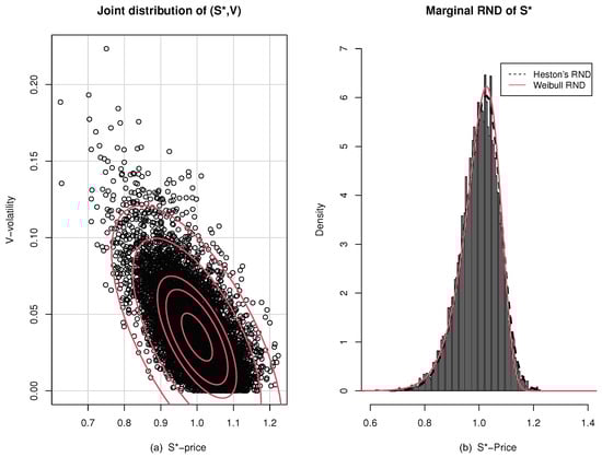 In this case, ; hence, for a short contract duration with year, we used Milstein’s (reflective) scheme to obtain a Monte Carlo sample of 10,000 simulated pairs with a standardized spot price and volatility, according to the SV model in (1). The results of their joint distribution is presented in Figure 2a. In Figure 2b, we present a histogram of the simulated marginal distribution of the spot price . The mean and standard deviation of these M simulated spot price values are and . We also include in the figure the curve of the implied (by ) Heston’s RND, as computed directly using (A5). As is expected in the case of risk neutrality modeling the spot prices of an index, the implied RND is negatively skewed (), which suggests that it is comparable to the Weibull distribution discussed in Section 4.4. To that end and since we do not have the actual option data used by [18], we simply matched to the ‘observed’ value of and use this to obtain the numerical solution of Equation (24) as , where . For comparison, we also include the plot of the RND in Figure 2b. As can be seen, the two RND curves are almost indistinguishable.
