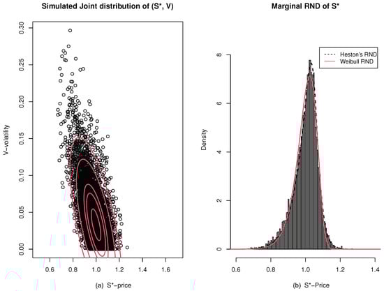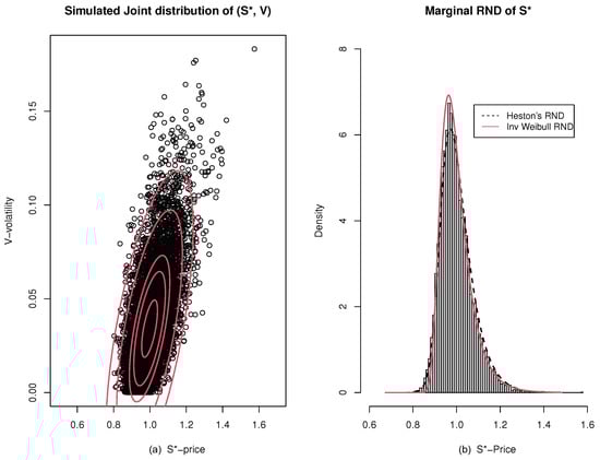 To further illustrate the applicability of the proposed RNDs to situations with distinctly positive skewness, we again consider the calibrated parametrization of [18] that we used for Figure 2 but with a hypothetically positive correlation, so that = (1.15, (0.04/1.15), 0.39, 0.64). The simulated Monte Carlo distributions (both joint and marginal) are presented in Figure 3, exhibiting the distinctly positive skewness of the Heston’s RND (calculated from (A5)). This suggests that it is comparable to the inverse Weibull distribution discussed in Section 4.5. The mean and standard deviation of these M simulated spot price values are and . Again, the value of is matched to to obtain the solution of Equation (26) as , where . Accordingly, we include the plot of the RND to Figure 3b for comparison, illustrating the extent of the agreement between the Heston’s (implied) RND and the inverse Weibull distribution in this case (with a distinctly positives skew).