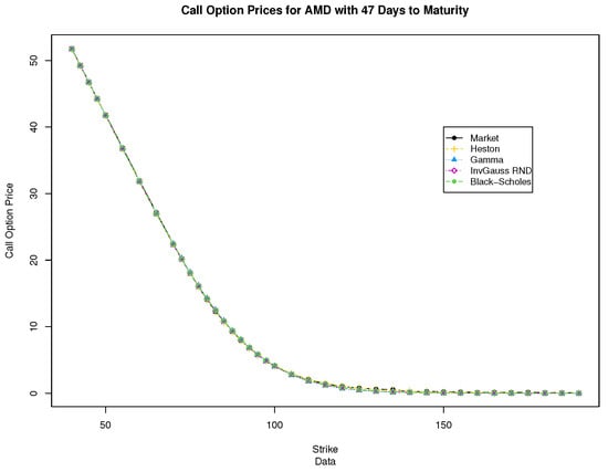 Since in this case, we have the actual market option prices available, we can estimate the parameter , thereby defining these distributions directly using the ‘standard’ Black–Scholes implied volatility, namely . This entails using the optim(·) function again to minimize the with respect to the single parameter . This standard estimation procedure yields , so that . For this value, we present the graphs of the gamma, inverse Gaussian, and log-normal RNDs in Figure 5b, as in Table 1. The extent of their agreement with the Heston’s implied RND is evident. To further demonstrate this point, we calculate the option prices under each of the modeled RNDs and calculate the corresponding . The results of this comparison are presented in Table 2. Finally, Figure 6 shows the option price curves for each of these pricing models, which are virtually almost identical in this example.